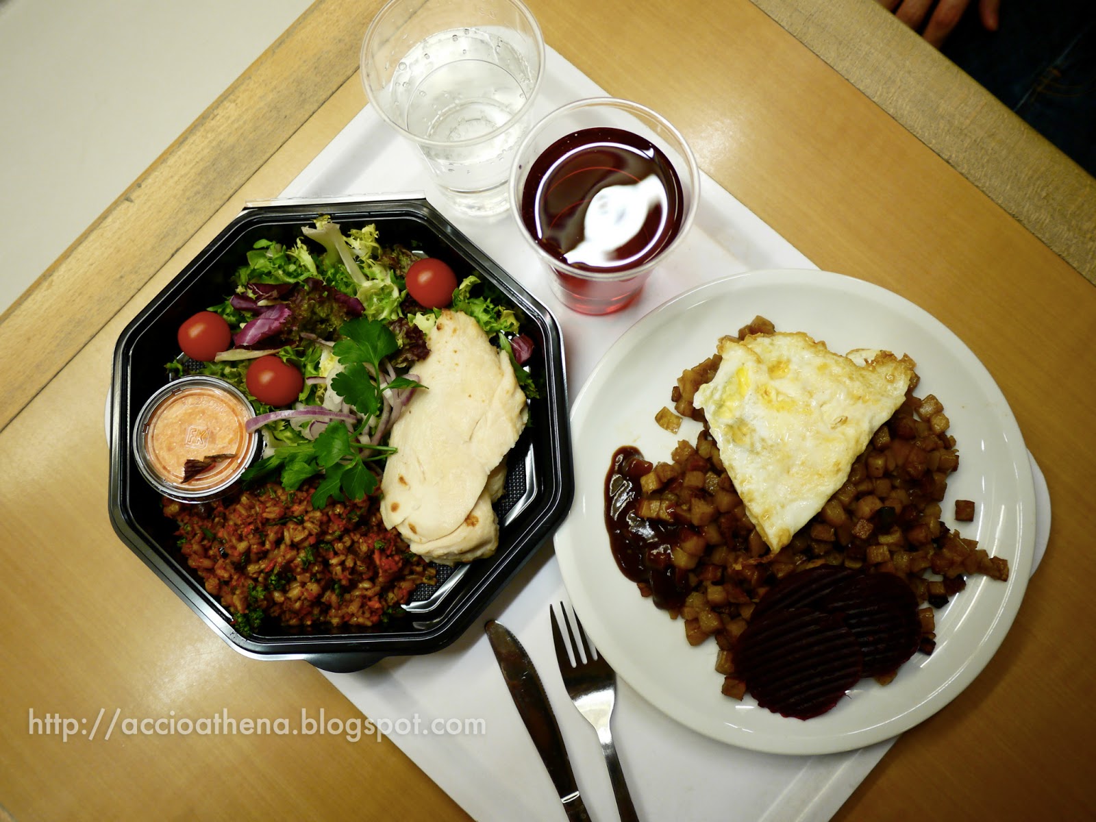 | 在船上餐廳的購買的餐點。左邊是雞肉生菜米沙拉, 右邊是一堆炒馬鈴薯+荷包蛋+醃漬甜菜根,"很瑞典" 的食物(老實說我不愛 :P) |