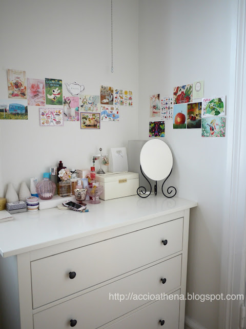 既然提到明信片,文章最後就讓我炫耀一下我這個展示心愛明信片的小角落吧。我把這個衣櫃當成梳妝台使用(只有三個抽屜是不是應該叫作三斗櫃啊??)兩邊牆上貼了我特別鍾愛的明信片或廣告DM,讓我每天梳妝打扮都心情飛揚♬ 把喜歡的東西擺滿專屬自己的角落,其實也是哄自己開心的小祕方之一吧。